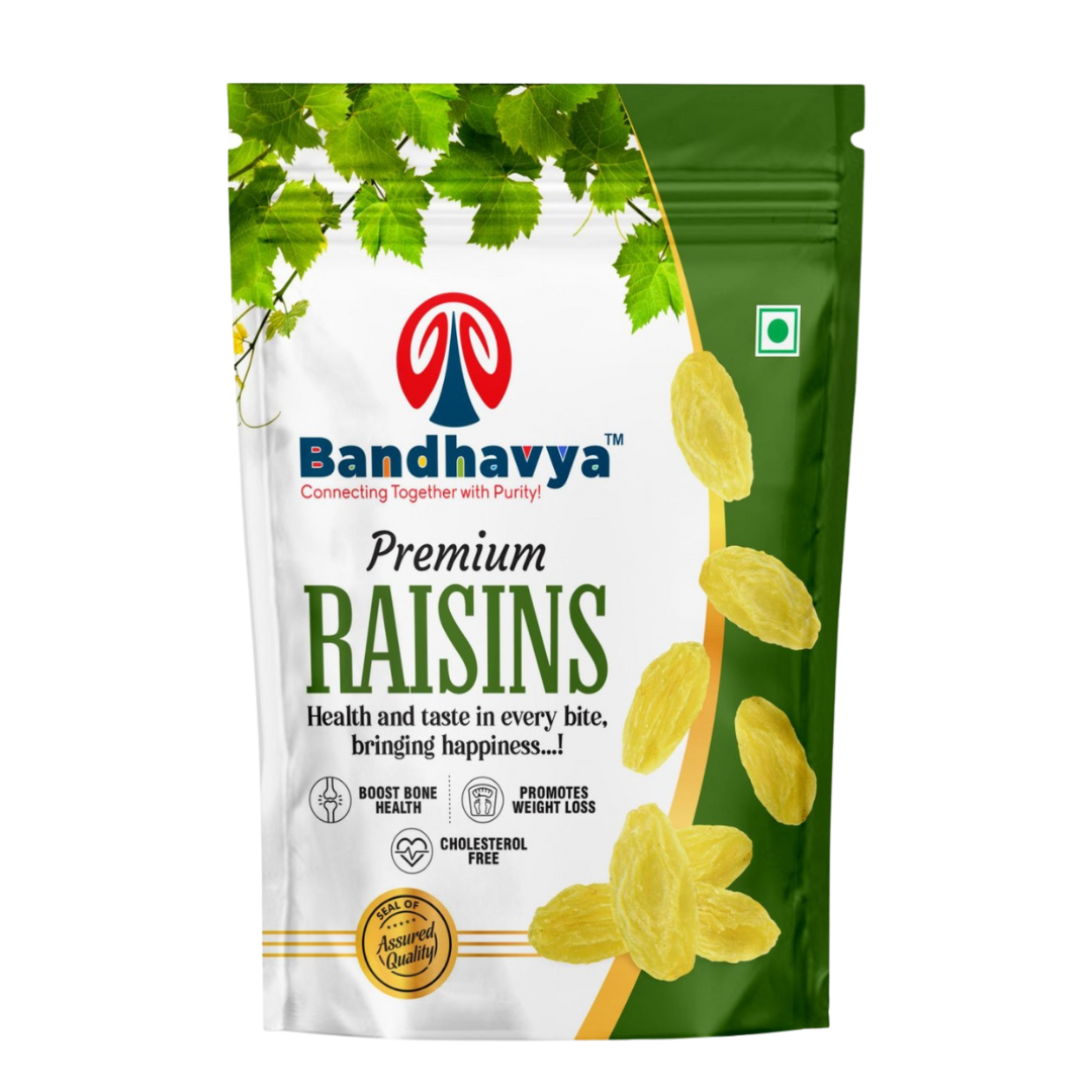 Premium Raisins are naturally sweet, sun-dried gems packed with energy, fiber, and essential minerals. Carefully sourced and hygienically packed, these raisins are a powerhouse of iron, potassium, and antioxidants that support digestion, boost immunity, and promote heart health. Whether eaten as a healthy snack, added to desserts, or used in traditional recipes, Bandhavya Premium Raisins bring a burst of natural sweetness and nutrition to your everyday diet.